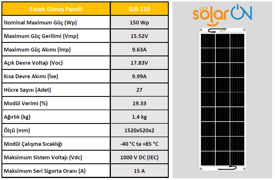 SolarOn Esnek Güneş Paneli 150 Watt Dikey Esnek Güneş Paneli nedir ? Esnek Güneş paneli Özellikleri nedir ve ömrü ne kadardır ? Kısaca bu sorulara Cevap vereceğiz.- Esnek Güneş Paneli, Esnek hücre ile üretilmiş olan güneş panelleridir. Esneme ve açı verme oranı diğer panellere göre fazladır. %50 ve daha az açı verilen yerlerde kullanılabilir. - Esnek Güneş Paneli, Esneme özelliği yüksek Mono Perc hücre ile üretilmiş olan panellerdir. Esneme ve açı verme oranı %50 dir. Tekne, yat ve karavan uygulamalarına uygundur. - Esnek Güneş Paneli ve Yarı Esnek Güneş Paneli türleri Ömür olarak aynıdırlar. Aslında panel ömrü belirlenirken kullanılan malzemeye dikkat edilmelidir. Güneş panellerimiz;Korozyana, yaşlanmaya, asit yağmurlarına, UV ışınlarına, kirlenmeye ve kir tutmaya karşı dirençlidir. - Esnek güneş panellerimizin ömür beklentisi 20 yıldır. - Siyah ve Beyaz Backsheet(Arka Plan) seçeneğiDİKKAT !! - Esnek ve Yarı Esnek Güneş Panelleri dış ortamdan gelebilecek sert ve sivri cisimlere karşı dayanıklı değildir. - Güneş Paneli üzerinde kazıma, delme vb. zarar verecek uygulamalar yapılmamaldır.- Güneş Paneli kablolarını sökülmemelidir.- Talimatlara uygun açı derecesinin üzerine çıkılmamalıdır.- Yanıcı ve yakıcı maddeleri temas ettirmemelidir. FLEXİBLE SOLAR PANELWhat is a Flexible Solar Panel? What are the Features of the Flexible Solar panel and how long does it last?We will briefly answer these questions.- Flexible Solar Panel are solar panels produced with flexible cells. The rate of stretching and angling is higher than other panels. It can be used in places where there is an angle of 50% or less.- Flexible Solar Panels are panels produced with Mono Perc cells with high flexibility. The rate of stretching and angling is 50%. It is suitable for boat, yacht and caravan applications.- Types of Flexible Solar Panel and Semi-Flexible Solar Panel are the same as Lifetime. In fact, attention should be paid to the material used when determining the panel life. Our solar panels;It is resistant to corrosion, aging, acid rain, UV rays, pollution and dirt retention.- The life expectancy of our flexible solar panels is 20 years.ATTENTION !!- Flexible and Semi-Flexible Solar Panels are not resistant to hard and sharp objects that may come from the outside environment.- Scraping, drilling, etc. on the Solar Panel. Harmful applications should not be made.- Solar Panel cables should not be disconnected.- Do not exceed the angle degree in accordance with the instructions.- It should not come into contact with flammable and combustible materials.Tüm Esnek Panel modellerimize bu sayfadan ulaşabilirsiniz.Blog sitemizde Esnek paneller hakkında ayrıntılı bilgi alabilirsiniz. Devamını Oku