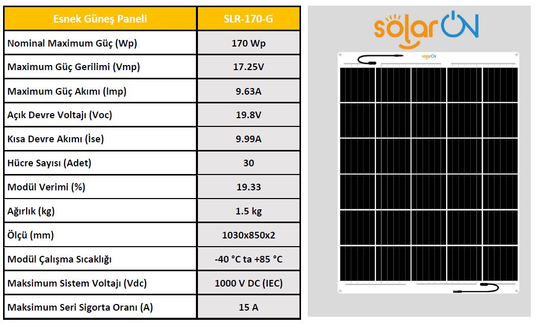 SolarOn Esnek Güneş Paneli 170 Watt Esnek Güneş Paneli nedir ? Esnek Güneş paneli Özellikleri nedir ve ömrü ne kadardır ? Kısaca bu sorulara Cevap vereceğiz.- Esnek Güneş Paneli, Esnek hücre ile üretilmiş olan güneş panelleridir. Esneme ve açı verme oranı diğer panellere göre fazladır. %50 ve daha az açı verilen yerlerde kullanılabilir. - Esnek Güneş Paneli, Esneme özelliği yüksek Mono Perc hücre ile üretilmiş olan panellerdir. Esneme ve açı verme oranı %50 dir. Tekne, yat ve karavan uygulamalarına uygundur. - Esnek Güneş Paneli ve Yarı Esnek Güneş Paneli türleri Ömür olarak aynıdırlar. Aslında panel ömrü belirlenirken kullanılan malzemeye dikkat edilmelidir. Güneş panellerimiz;Korozyana, yaşlanmaya, asit yağmurlarına, UV ışınlarına, kirlenmeye ve kir tutmaya karşı dirençlidir. - Esnek güneş panellerimizin ömür beklentisi 20 yıldır. DİKKAT !! - Esnek ve Yarı Esnek Güneş Panelleri dış ortamdan gelebilecek sert ve sivri cisimlere karşı dayanıklı değildir. - Güneş Paneli üzerinde kazıma, delme vb. zarar verecek uygulamalar yapılmamaldır.- Güneş Paneli kablolarını sökülmemelidir.- Talimatlara uygun açı derecesinin üzerine çıkılmamalıdır.- Yanıcı ve yakıcı maddeleri temas ettirmemelidir. FLEXİBLE SOLAR PANELWhat is a Flexible Solar Panel? What are the Features of the Flexible Solar panel and how long does it last?We will briefly answer these questions.- Flexible Solar Panel are solar panels produced with flexible cells. The rate of stretching and angling is higher than other panels. It can be used in places where there is an angle of 50% or less.- Flexible Solar Panels are panels produced with Mono Perc cells with high flexibility. The rate of stretching and angling is 50%. It is suitable for boat, yacht and caravan applications.- Types of Flexible Solar Panel and Semi-Flexible Solar Panel are the same as Lifetime. In fact, attention should be paid to the material used when determining the panel life. Our solar panels;It is resistant to corrosion, aging, acid rain, UV rays, pollution and dirt retention.- The life expectancy of our flexible solar panels is 20 years.ATTENTION !!- Flexible and Semi-Flexible Solar Panels are not resistant to hard and sharp objects that may come from the outside environment.- Scraping, drilling, etc. on the Solar Panel. Harmful applications should not be made.- Solar Panel cables should not be disconnected.- Do not exceed the angle degree in accordance with the instructions.- It should not come into contact with flammable and combustible materials.Tüm Esnek panel modellerimize bu sayfamızdan ulaşabilirsiniz.Blog sitemizde Esnek paneller hakkında ayrıntılı bilgi alabilirsiniz. Devamını Oku
