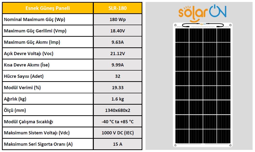 SolarOn Esnek Güneş Paneli 180 Watt Esnek Güneş Paneli nedir ? Esnek Güneş paneli Özellikleri nedir ve ömrü ne kadardır ? Kısaca bu sorulara Cevap vereceğiz.- Esnek Güneş Paneli, Esnek hücre ile üretilmiş olan güneş panelleridir. Esneme ve açı verme oranı diğer panellere göre fazladır. %50 ve daha az açı verilen yerlerde kullanılabilir. - Esnek Güneş Paneli, Esneme özelliği yüksek Mono Perc hücre ile üretilmiş olan panellerdir. Esneme ve açı verme oranı %50 dir. Tekne, yat ve karavan uygulamalarına uygundur. - Esnek Güneş Paneli ve Yarı Esnek Güneş Paneli türleri Ömür olarak aynıdırlar. Aslında panel ömrü belirlenirken kullanılan malzemeye dikkat edilmelidir. Güneş panellerimiz;Korozyana, yaşlanmaya, asit yağmurlarına, UV ışınlarına, kirlenmeye ve kir tutmaya karşı dirençlidir. - Esnek güneş panellerimizin ömür beklentisi 20 yıldır. - Siyah ve Beyaz Backsheet(Arka Plan) seçeneğiDİKKAT !! - Esnek ve Yarı Esnek Güneş Panelleri dış ortamdan gelebilecek sert ve sivri cisimlere karşı dayanıklı değildir. - Güneş Paneli üzerinde kazıma, delme vb. zarar verecek uygulamalar yapılmamaldır.- Güneş Paneli kablolarını sökülmemelidir.- Talimatlara uygun açı derecesinin üzerine çıkılmamalıdır.- Yanıcı ve yakıcı maddeleri temas ettirmemelidir. FLEXİBLE SOLAR PANELWhat is a Flexible Solar Panel? What are the Features of the Flexible Solar panel and how long does it last?We will briefly answer these questions.- Flexible Solar Panel are solar panels produced with flexible cells. The rate of stretching and angling is higher than other panels. It can be used in places where there is an angle of 50% or less.- Flexible Solar Panels are panels produced with Mono Perc cells with high flexibility. The rate of stretching and angling is 50%. It is suitable for boat, yacht and caravan applications.- Types of Flexible Solar Panel and Semi-Flexible Solar Panel are the same as Lifetime. In fact, attention should be paid to the material used when determining the panel life. Our solar panels;It is resistant to corrosion, aging, acid rain, UV rays, pollution and dirt retention.- The life expectancy of our flexible solar panels is 20 years.ATTENTION !!- Flexible and Semi-Flexible Solar Panels are not resistant to hard and sharp objects that may come from the outside environment.- Scraping, drilling, etc. on the Solar Panel. Harmful applications should not be made.- Solar Panel cables should not be disconnected.- Do not exceed the angle degree in accordance with the instructions.- It should not come into contact with flammable and combustible materials.TÜM ESNEK GÜNEŞ PANELİ MODELLERİMİZE BURADAN GÖZ ATABİLİRSİNİZ Devamını Oku
