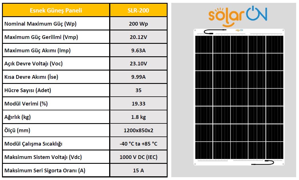 SolarOn Esnek Güneş Paneli 200 Watt Esnek Güneş Paneli nedir ? Esnek Güneş paneli Özellikleri nedir ve ömrü ne kadardır ? Kısaca bu sorulara Cevap vereceğiz.- Esnek Güneş Paneli, Esnek hücre ile üretilmiş olan güneş panelleridir. Esneme ve açı verme oranı diğer panellere göre fazladır. %50 ve daha az açı verilen yerlerde kullanılabilir. - Esnek Güneş Paneli, Esneme özelliği yüksek Mono Perc hücre ile üretilmiş olan panellerdir. Esneme ve açı verme oranı %50 dir. Tekne, yat ve karavan uygulamalarına uygundur. - Esnek Güneş Paneli ve Yarı Esnek Güneş Paneli türleri Ömür olarak aynıdırlar. Aslında panel ömrü belirlenirken kullanılan malzemeye dikkat edilmelidir. Güneş panellerimiz;Korozyana, yaşlanmaya, asit yağmurlarına, UV ışınlarına, kirlenmeye ve kir tutmaya karşı dirençlidir. - Esnek güneş panellerimizin ömür beklentisi 20 yıldır. DİKKAT !! - Esnek ve Yarı Esnek Güneş Panelleri dış ortamdan gelebilecek sert ve sivri cisimlere karşı dayanıklı değildir. - Güneş Paneli üzerinde kazıma, delme vb. zarar verecek uygulamalar yapılmamaldır.- Güneş Paneli kablolarını sökülmemelidir.- Talimatlara uygun açı derecesinin üzerine çıkılmamalıdır.- Yanıcı ve yakıcı maddeleri temas ettirmemelidir. FLEXİBLE SOLAR PANELWhat is a Flexible Solar Panel? What are the Features of the Flexible Solar panel and how long does it last?We will briefly answer these questions.- Flexible Solar Panel are solar panels produced with flexible cells. The rate of stretching and angling is higher than other panels. It can be used in places where there is an angle of 50% or less.- Flexible Solar Panels are panels produced with Mono Perc cells with high flexibility. The rate of stretching and angling is 50%. It is suitable for boat, yacht and caravan applications.- Types of Flexible Solar Panel and Semi-Flexible Solar Panel are the same as Lifetime. In fact, attention should be paid to the material used when determining the panel life. Our solar panels;It is resistant to corrosion, aging, acid rain, UV rays, pollution and dirt retention.- The life expectancy of our flexible solar panels is 20 years.ATTENTION !!- Flexible and Semi-Flexible Solar Panels are not resistant to hard and sharp objects that may come from the outside environment.- Scraping, drilling, etc. on the Solar Panel. Harmful applications should not be made.- Solar Panel cables should not be disconnected.- Do not exceed the angle degree in accordance with the instructions.- It should not come into contact with flammable and combustible materials.TÜM ESNEK GÜNEŞ PANELİ MODELLERİMİZE BURADAN GÖZ ATABİLİRSİNİZBlog sitemizde Esnek paneller hakkında ayrıntılı bilgi alabilirsiniz. Devamını Oku