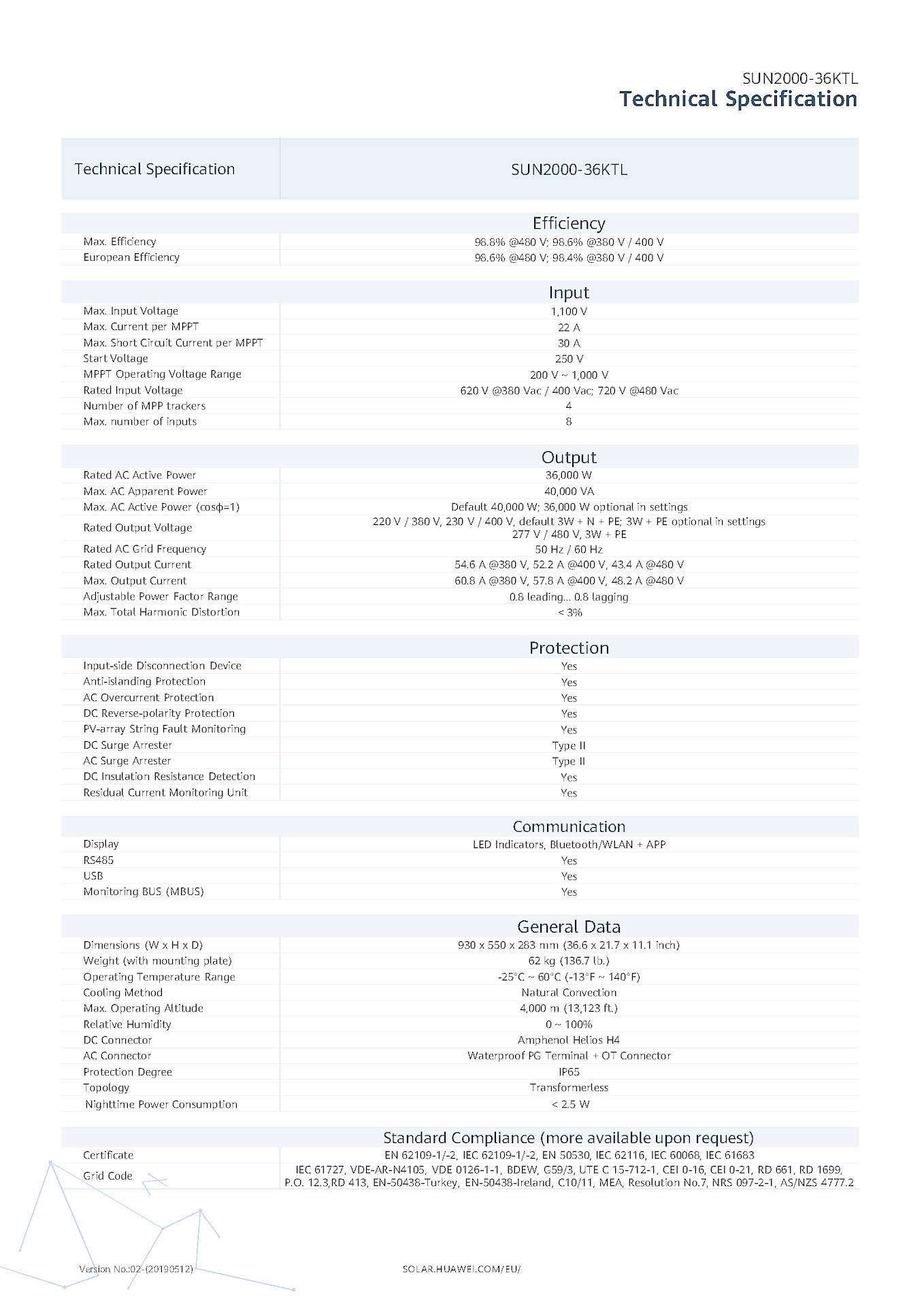 Huawei "Sun2000-36 KTL" Datasheet pdf"| Teknik Özellikler | Açıklamalar |
