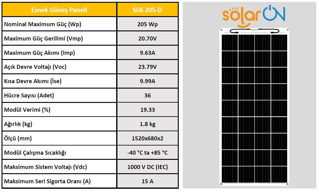 SolarOn Esnek Güneş Paneli 205 Watt Esnek Güneş Paneli nedir ? Esnek Güneş paneli Özellikleri nedir ve ömrü ne kadardır ? Kısaca bu sorulara Cevap vereceğiz.- Esnek Güneş Paneli, Esnek hücre ile üretilmiş olan güneş panelleridir. Esneme ve açı verme oranı diğer panellere göre fazladır. %50 ve daha az açı verilen yerlerde kullanılabilir. - Esnek Güneş Paneli, Esneme özelliği yüksek Mono Perc hücre ile üretilmiş olan panellerdir. Esneme ve açı verme oranı %50 dir. Tekne, yat ve karavan uygulamalarına uygundur. - Esnek Güneş Paneli ve Yarı Esnek Güneş Paneli türleri Ömür olarak aynıdırlar. Aslında panel ömrü belirlenirken kullanılan malzemeye dikkat edilmelidir. Güneş panellerimiz;Korozyana, yaşlanmaya, asit yağmurlarına, UV ışınlarına, kirlenmeye ve kir tutmaya karşı dirençlidir. - Esnek güneş panellerimizin ömür beklentisi 20 yıldır. - Siyah ve Beyaz Backsheet(Arka Plan) seçeneğiDİKKAT !! - Esnek ve Yarı Esnek Güneş Panelleri dış ortamdan gelebilecek sert ve sivri cisimlere karşı dayanıklı değildir. - Güneş Paneli üzerinde kazıma, delme vb. zarar verecek uygulamalar yapılmamalıdır.- Güneş Paneli kablolarını sökülmemelidir.- Talimatlara uygun açı derecesinin üzerine çıkılmamalıdır.- Yanıcı ve yakıcı maddeleri temas ettirmemelidir. FLEXİBLE SOLAR PANELWhat is a Flexible Solar Panel? What are the Features of the Flexible Solar panel and how long does it last?We will briefly answer these questions.- Flexible Solar Panel are solar panels produced with flexible cells. The rate of stretching and angling is higher than other panels. It can be used in places where there is an angle of 50% or less.- Flexible Solar Panels are panels produced with Mono Perc cells with high flexibility. The rate of stretching and angling is 50%. It is suitable for boat, yacht and caravan applications.- Types of Flexible Solar Panel and Semi-Flexible Solar Panel are the same as Lifetime. In fact, attention should be paid to the material used when determining the panel life. Our solar panels;It is resistant to corrosion, aging, acid rain, UV rays, pollution and dirt retention.- The life expectancy of our flexible solar panels is 20 years.ATTENTION !!- Flexible and Semi-Flexible Solar Panels are not resistant to hard and sharp objects that may come from the outside environment.- Scraping, drilling, etc. on the Solar Panel. Harmful applications should not be made.- Solar Panel cables should not be disconnected.- Do not exceed the angle degree in accordance with the instructions.- It should not come into contact with flammable and combustible materials.TÜM ESNEK GÜNEŞ PANELİ MODELLERİMİZE BURADAN GÖZ ATABİLİRSİNİZ Devamını Oku
