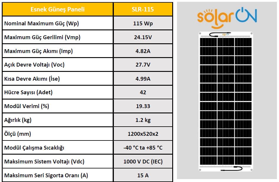SolarOn Esnek Güneş Paneli 115 Watt Esnek Güneş Paneli nedir ? Esnek Güneş paneli Özellikleri nedir ve ömrü ne kadardır ? Kısaca bu sorulara Cevap vereceğiz.- Esnek Güneş Paneli, Esnek hücre ile üretilmiş olan güneş panelleridir. Esneme ve açı verme oranı diğer panellere göre fazladır. %50 ve daha az açı verilen yerlerde kullanılabilir. - Esnek Güneş Paneli, Esneme özelliği yüksek Mono Perc hücre ile üretilmiş olan panellerdir. Esneme ve açı verme oranı %50 dir. Tekne, yat ve karavan uygulamalarına uygundur. - Esnek Güneş Paneli ve Yarı Esnek Güneş Paneli türleri Ömür olarak aynıdırlar. Aslında panel ömrü belirlenirken kullanılan malzemeye dikkat edilmelidir. Güneş panellerimiz;Korozyana, yaşlanmaya, asit yağmurlarına, UV ışınlarına, kirlenmeye ve kir tutmaya karşı dirençlidir. - Esnek güneş panellerimizin ömür beklentisi 20 yıldır. - Siyah ve Beyaz Backsheet(Arka Plan) seçeneğiDİKKAT !! - Esnek ve Yarı Esnek Güneş Panelleri dış ortamdan gelebilecek sert ve sivri cisimlere karşı dayanıklı değildir. - Güneş Paneli üzerinde kazıma, delme vb. zarar verecek uygulamalar yapılmamaldır.- Güneş Paneli kablolarını sökülmemelidir.- Talimatlara uygun açı derecesinin üzerine çıkılmamalıdır.- Yanıcı ve yakıcı maddeleri temas ettirmemelidir. FLEXİBLE SOLAR PANEL What is a Flexible Solar Panel? What are the Features of the Flexible Solar panel and how long does it last?We will briefly answer these questions.- Flexible Solar Panel are solar panels produced with flexible cells. The rate of stretching and angling is higher than other panels. It can be used in places where there is an angle of 50% or less.- Flexible Solar Panels are panels produced with Mono Perc cells with high flexibility. The rate of stretching and angling is 50%. It is suitable for boat, yacht and caravan applications.- Types of Flexible Solar Panel and Semi-Flexible Solar Panel are the same as Lifetime. In fact, attention should be paid to the material used when determining the panel life. Our solar panels;It is resistant to corrosion, aging, acid rain, UV rays, pollution and dirt retention.- The life expectancy of our flexible solar panels is 20 years.ATTENTION !!- Flexible and Semi-Flexible Solar Panels are not resistant to hard and sharp objects that may come from the outside environment.- Scraping, drilling, etc. on the Solar Panel. Harmful applications should not be made.- Solar Panel cables should not be disconnected.- Do not exceed the angle degree in accordance with the instructions.- It should not come into contact with flammable and combustible materials.TÜM ESNEK GÜNEŞ PANELİ MODELLERİMİZE BURADAN GÖZ ATABİLİRSİNİZ Devamını Oku