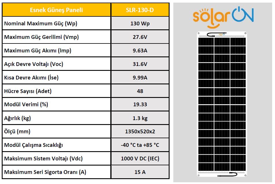 SolarOn Esnek Güneş Paneli 130 Watt - Dikey Esnek Güneş Paneli nedir ? Esnek Güneş paneli Özellikleri nedir ve ömrü ne kadardır ? Kısaca bu sorulara Cevap vereceğiz.- Esnek Güneş Paneli, Esnek hücre ile üretilmiş olan güneş panelleridir. Esneme ve açı verme oranı diğer panellere göre fazladır. %50 ve daha az açı verilen yerlerde kullanılabilir. - Esnek Güneş Paneli, Esneme özelliği yüksek Mono Perc hücre ile üretilmiş olan panellerdir. Esneme ve açı verme oranı %50 dir. Tekne, yat ve karavan uygulamalarına uygundur. - Esnek Güneş Paneli ve Yarı Esnek Güneş Paneli türleri Ömür olarak aynıdırlar. Aslında panel ömrü belirlenirken kullanılan malzemeye dikkat edilmelidir. Güneş panellerimiz;Korozyana, yaşlanmaya, asit yağmurlarına, UV ışınlarına, kirlenmeye ve kir tutmaya karşı dirençlidir. - Esnek güneş panellerimizin ömür beklentisi 20 yıldır. - Siyah ve Beyaz Backsheet(Arka Plan) seçeneğiDİKKAT !! - Esnek ve Yarı Esnek Güneş Panelleri dış ortamdan gelebilecek sert ve sivri cisimlere karşı dayanıklı değildir. - Güneş Paneli üzerinde kazıma, delme vb. zarar verecek uygulamalar yapılmamaldır.- Güneş Paneli kablolarını sökülmemelidir.- Talimatlara uygun açı derecesinin üzerine çıkılmamalıdır.- Yanıcı ve yakıcı maddeleri temas ettirmemelidir. FLEXİBLE SOLAR PANEL What is a Flexible Solar Panel? What are the Features of the Flexible Solar panel and how long does it last?We will briefly answer these questions.- Flexible Solar Panel are solar panels produced with flexible cells. The rate of stretching and angling is higher than other panels. It can be used in places where there is an angle of 50% or less.- Flexible Solar Panels are panels produced with Mono Perc cells with high flexibility. The rate of stretching and angling is 50%. It is suitable for boat, yacht and caravan applications.- Types of Flexible Solar Panel and Semi-Flexible Solar Panel are the same as Lifetime. In fact, attention should be paid to the material used when determining the panel life. Our solar panels;It is resistant to corrosion, aging, acid rain, UV rays, pollution and dirt retention.- The life expectancy of our flexible solar panels is 20 years.ATTENTION !!- Flexible and Semi-Flexible Solar Panels are not resistant to hard and sharp objects that may come from the outside environment.- Scraping, drilling, etc. on the Solar Panel. Harmful applications should not be made.- Solar Panel cables should not be disconnected.- Do not exceed the angle degree in accordance with the instructions.- It should not come into contact with flammable and combustible materials.TÜM ESNEK GÜNEŞ PANELİ MODELLERİMİZE BURADAN GÖZ ATABİLİRSİNİZ Devamını Oku