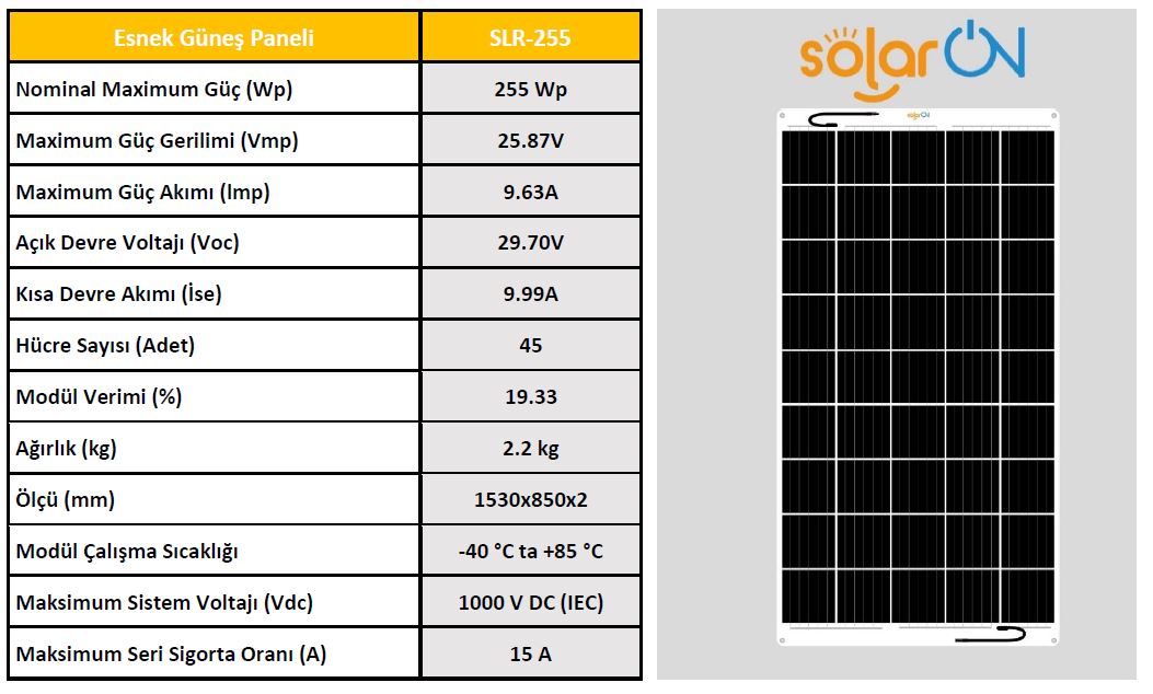 SolarOn Esnek Güneş Paneli 255 Watt Esnek Güneş Paneli nedir ? Esnek Güneş paneli Özellikleri nedir ve ömrü ne kadardır ? Kısaca bu sorulara Cevap vereceğiz.- Esnek Güneş Paneli, Esnek hücre ile üretilmiş olan güneş panelleridir. Esneme ve açı verme oranı diğer panellere göre fazladır. %50 ve daha az açı verilen yerlerde kullanılabilir. - Esnek Güneş Paneli, Esneme özelliği yüksek Mono Perc hücre ile üretilmiş olan panellerdir. Esneme ve açı verme oranı %50 dir. Tekne, yat ve karavan uygulamalarına uygundur. - Esnek Güneş Paneli ve Yarı Esnek Güneş Paneli türleri Ömür olarak aynıdırlar. Aslında panel ömrü belirlenirken kullanılan malzemeye dikkat edilmelidir. Güneş panellerimiz;Korozyana, yaşlanmaya, asit yağmurlarına, UV ışınlarına, kirlenmeye ve kir tutmaya karşı dirençlidir. - Esnek güneş panellerimizin ömür beklentisi 20 yıldır. DİKKAT !! - Esnek ve Yarı Esnek Güneş Panelleri dış ortamdan gelebilecek sert ve sivri cisimlere karşı dayanıklı değildir. - Güneş Paneli üzerinde kazıma, delme vb. zarar verecek uygulamalar yapılmamaldır.- Güneş Paneli kablolarını sökülmemelidir.- Talimatlara uygun açı derecesinin üzerine çıkılmamalıdır.- Yanıcı ve yakıcı maddeleri temas ettirmemelidir. FLEXİBLE SOLAR PANELWhat is a Flexible Solar Panel? What are the Features of the Flexible Solar panel and how long does it last?We will briefly answer these questions.- Flexible Solar Panel are solar panels produced with flexible cells. The rate of stretching and angling is higher than other panels. It can be used in places where there is an angle of 50% or less.- Flexible Solar Panels are panels produced with Mono Perc cells with high flexibility. The rate of stretching and angling is 50%. It is suitable for boat, yacht and caravan applications.- Types of Flexible Solar Panel and Semi-Flexible Solar Panel are the same as Lifetime. In fact, attention should be paid to the material used when determining the panel life. Our solar panels;It is resistant to corrosion, aging, acid rain, UV rays, pollution and dirt retention.- The life expectancy of our flexible solar panels is 20 years.ATTENTION !!- Flexible and Semi-Flexible Solar Panels are not resistant to hard and sharp objects that may come from the outside environment.- Scraping, drilling, etc. on the Solar Panel. Harmful applications should not be made.- Solar Panel cables should not be disconnected.- Do not exceed the angle degree in accordance with the instructions.- It should not come into contact with flammable and combustible materials.TÜM ESNEK GÜNEŞ PANELİ MODELLERİMİZE BURADAN GÖZ ATABİLİRSİNİZ Devamını Oku