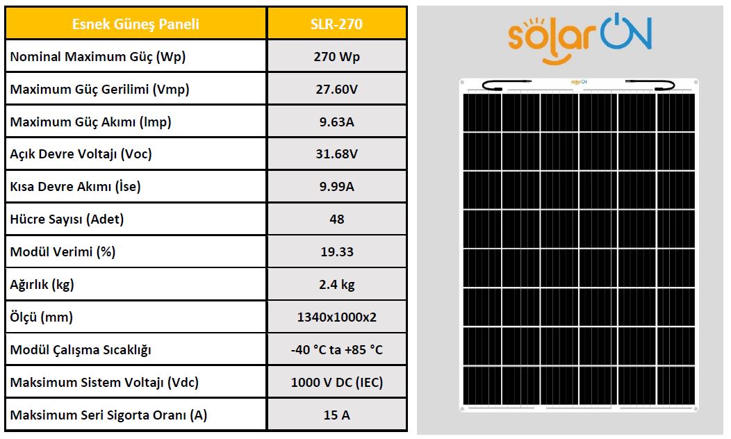 SolarOn Esnek Güneş Paneli 270 WattEsnek Güneş Paneli nedir ? Esnek Güneş paneli Özellikleri nedir ve ömrü ne kadardır ? Kısaca bu sorulara Cevap vereceğiz.- Esnek Güneş Paneli, Esnek hücre ile üretilmiş olan güneş panelleridir. Esneme ve açı verme oranı diğer panellere göre fazladır. %50 ve daha az açı verilen yerlerde kullanılabilir. - Esnek Güneş Paneli, Esneme özelliği yüksek Mono Perc hücre ile üretilmiş olan panellerdir. Esneme ve açı verme oranı %50 dir. Tekne, yat ve karavan uygulamalarına uygundur. - Esnek Güneş Paneli ve Yarı Esnek Güneş Paneli türleri Ömür olarak aynıdırlar. Aslında panel ömrü belirlenirken kullanılan malzemeye dikkat edilmelidir. Güneş panellerimiz;Korozyana, yaşlanmaya, asit yağmurlarına, UV ışınlarına, kirlenmeye ve kir tutmaya karşı dirençlidir. - Esnek güneş panellerimizin ömür beklentisi 20 yıldır. DİKKAT !! - Esnek ve Yarı Esnek Güneş Panelleri dış ortamdan gelebilecek sert ve sivri cisimlere karşı dayanıklı değildir. - Güneş Paneli üzerinde kazıma, delme vb. zarar verecek uygulamalar yapılmamaldır.- Güneş Paneli kablolarını sökülmemelidir.- Talimatlara uygun açı derecesinin üzerine çıkılmamalıdır.- Yanıcı ve yakıcı maddeleri temas ettirmemelidir. FLEXİBLE SOLAR PANELWhat is a Flexible Solar Panel? What are the differences with Flexible Solar Panels? What are the features of flexible solar panels and how long is their lifetime?We will briefly answer these questions.- Flexible Solar Panels are solar panels produced with a Sunpower (Flexible Cell) cell. Stretching and angulation rate is higher than other panels. It can be used in places with 50% or less angle. It is 2% more efficient than Mono Perc cells.- Semi Flexible Solar Panels are panels produced with Mono Perc cells. Stretch and angle coefficient is low. Suitable for boat, yacht and caravan applications. It can be used in places with an angle of 20% or less. Cell efficiency is 2% lower than full flexible cells.- Semi Flexible Solar Panel and Semi Flexible Solar Panel types are the same as Lifetime. In fact, attention should be paid to the material used when determining the panel life. Our solar panels made with ETFE material;It is resistant to corrosion, aging, acid rain, UV rays, dirt and dirt retention.- The life expectancy of our flexible and semi-flexible solar panels is 20 years.ATTENTION !!- Flexible and Semi-Flexible Solar Panels are not resistant to hard and sharp objects that may come from the outside.- Applications that may damage the Solar Panel, such as scraping, drilling, etc. should not be done.- Solar Panel cables should not be removed from inside the junction box.- The angle according to the instructions should not be exceeded.- It should not contact flammable and caustic materials. Devamını Oku