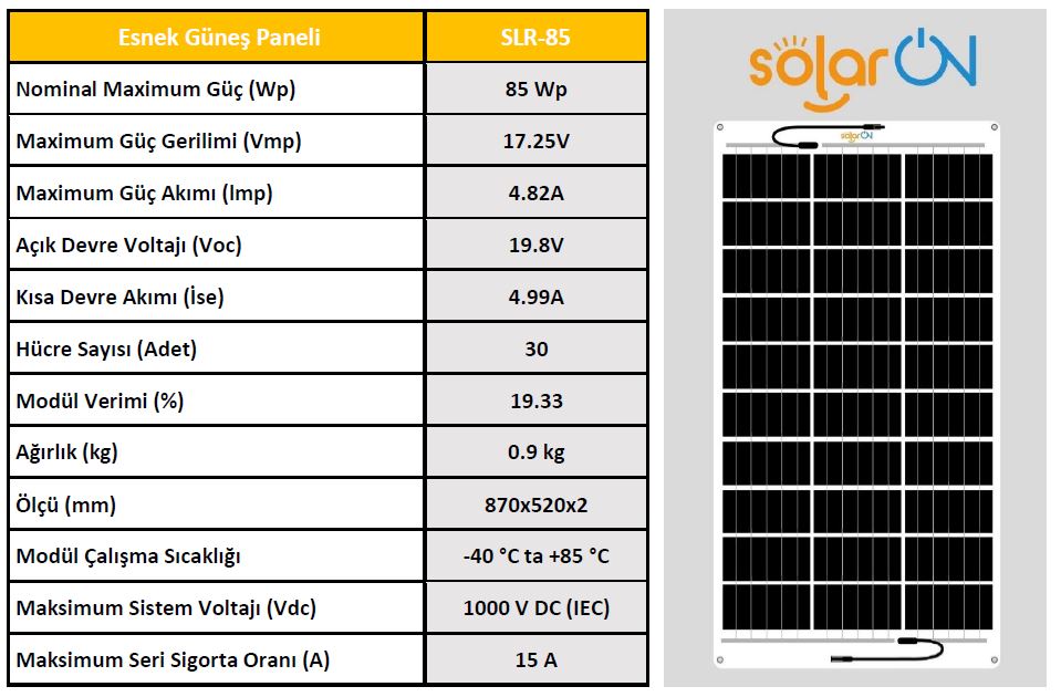 SolarOn Esnek Güneş Paneli 85 Watt Esnek Güneş Paneli nedir ? Esnek Güneş paneli Özellikleri nedir ve ömrü ne kadardır ? Kısaca bu sorulara Cevap vereceğiz.- Esnek Güneş Paneli, Esnek hücre ile üretilmiş olan güneş panelleridir. Esneme ve açı verme oranı diğer panellere göre fazladır. %50 ve daha az açı verilen yerlerde kullanılabilir. - Esnek Güneş Paneli, Esneme özelliği yüksek Mono Perc hücre ile üretilmiş olan panellerdir. Esneme ve açı verme oranı %50 dir. Tekne, yat ve karavan uygulamalarına uygundur. - Esnek Güneş Paneli ve Yarı Esnek Güneş Paneli türleri Ömür olarak aynıdırlar. Aslında panel ömrü belirlenirken kullanılan malzemeye dikkat edilmelidir. Güneş panellerimiz;Korozyana, yaşlanmaya, asit yağmurlarına, UV ışınlarına, kirlenmeye ve kir tutmaya karşı dirençlidir. - Esnek güneş panellerimizin ömür beklentisi 20 yıldır. - Siyah ve Beyaz Backsheet(Arka Plan) seçeneğiDİKKAT !! - Esnek ve Yarı Esnek Güneş Panelleri dış ortamdan gelebilecek sert ve sivri cisimlere karşı dayanıklı değildir. - Güneş Paneli üzerinde kazıma, delme vb. zarar verecek uygulamalar yapılmamaldır.- Güneş Paneli kablolarını sökülmemelidir.- Talimatlara uygun açı derecesinin üzerine çıkılmamalıdır.- Yanıcı ve yakıcı maddeleri temas ettirmemelidir. FLEXİBLE SOLAR PANEL What is a Flexible Solar Panel? What are the Features of the Flexible Solar panel and how long does it last?We will briefly answer these questions.- Flexible Solar Panel are solar panels produced with flexible cells. The rate of stretching and angling is higher than other panels. It can be used in places where there is an angle of 50% or less.- Flexible Solar Panels are panels produced with Mono Perc cells with high flexibility. The rate of stretching and angling is 50%. It is suitable for boat, yacht and caravan applications.- Types of Flexible Solar Panel and Semi-Flexible Solar Panel are the same as Lifetime. In fact, attention should be paid to the material used when determining the panel life. Our solar panels;It is resistant to corrosion, aging, acid rain, UV rays, pollution and dirt retention.- The life expectancy of our flexible solar panels is 20 years.ATTENTION !!- Flexible and Semi-Flexible Solar Panels are not resistant to hard and sharp objects that may come from the outside environment.- Scraping, drilling, etc. on the Solar Panel. Harmful applications should not be made.- Solar Panel cables should not be disconnected.- Do not exceed the angle degree in accordance with the instructions.- It should not come into contact with flammable and combustible materials.TÜM ESNEK GÜNEŞ PANELİ MODELLERİMİZE BURADAN GÖZ ATABİLİRSİNİZ Devamını Oku