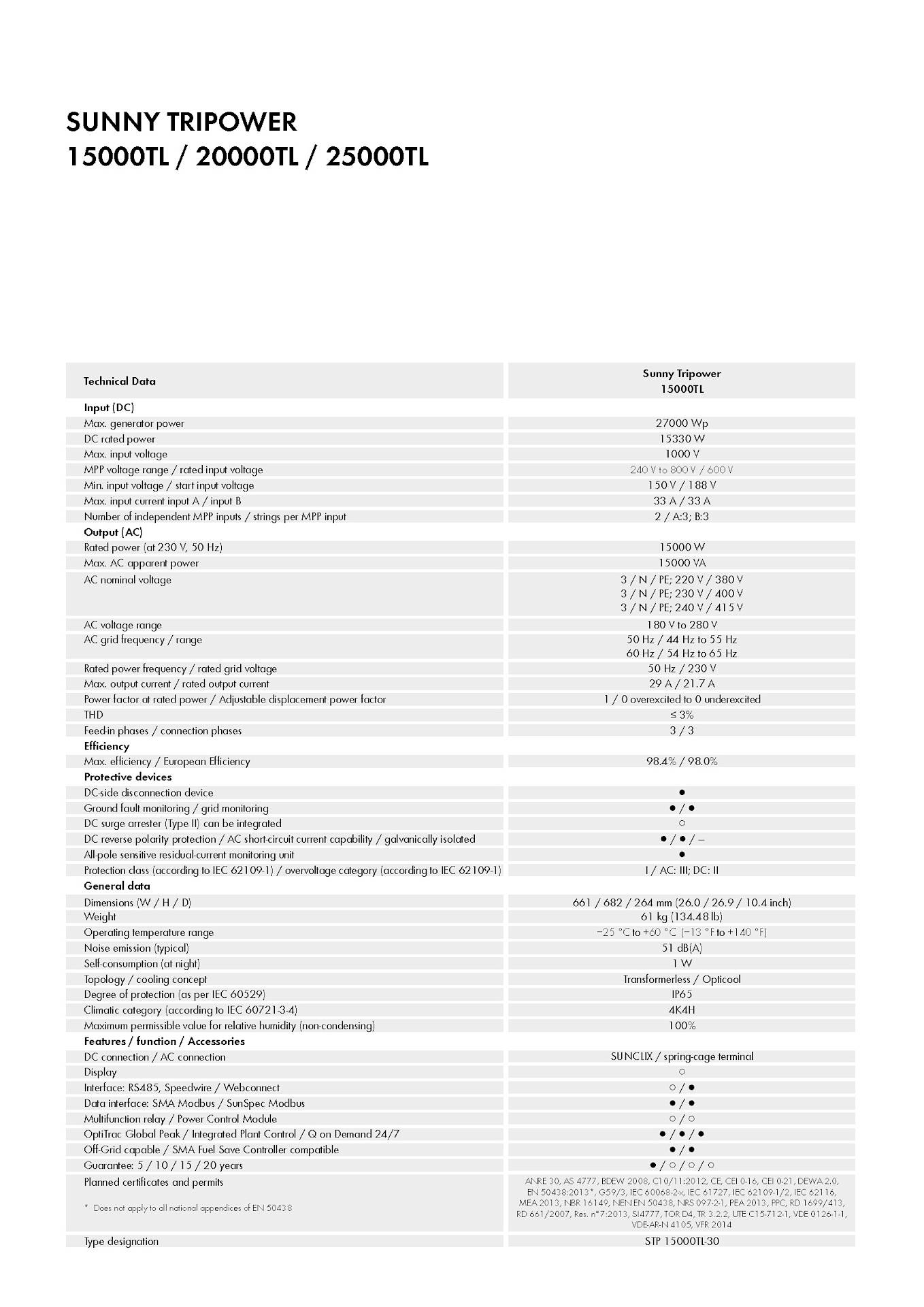 SMA Sunny Tripower 15000 TL 15 kw on-grid inverterBüyük ölçekli ticari sistemler ve güneş enerjisi santralleri için uyumlu uzman Sunny Tripower, ticari ve endüstriyel alanda kurulan büyük ölçekli sistemler için ideal eviricidir. Yüzde 98,4‘lük verimi ile sadece alışılmışın dışındaki yüksek üretim için değil, aynı zamanda geniş bir giriş gerilimi aralığı ile bağlantılı olarak çoklu dizi konsepti sayesinde, kullanılabilen çok çeşitli FV modülle yüksek bir tasarım esnekliği ve uyumluluk sunmaktadır. Şebekeye bağlantı noktasında doğrudan evirici üzerinden bir reaktif güç kontrolüne olanak tanıyan entegre edilebilir Plant Control gibi yeni şebeke yönetim fonksiyonlarının entegrasyonu, ileriye yönelik bir özelliktir. Bu sayede, harici kontrol ünitelerine ihtiyaç kalmaz ve sistem maliyetleri düşürülebilir. Talep edildiğinde reaktif güç tedariği ise bir diğer yeniliktir. SMA Sunny Tripower 15000 TL 15 kw on-grid inverter datasheet : SMA Sunny Tripower 25000 TL 25 kw on-grid inverter datasheet PDFSunny Tripower 15000TL / 20000TL / 25000TL PDF Devamını Oku